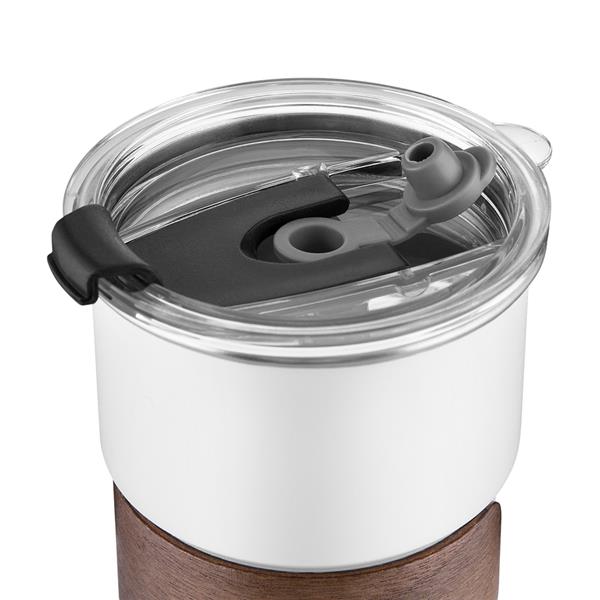 Copo de parede simples em aço inox 304 com capacidade de 250 ml, com canudo em inox. Tampa em plástico poliestireno (PS) que também possui um bico como forma alternativa de uso. Com pegador em fibra natural de noz. Possui acabamento externo com pintura fosca.