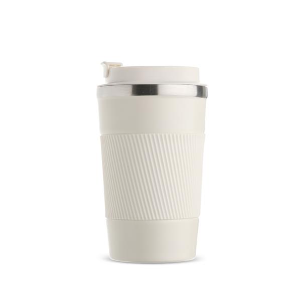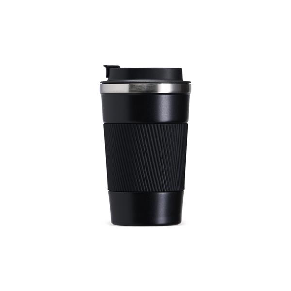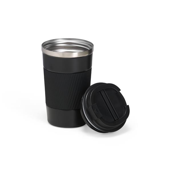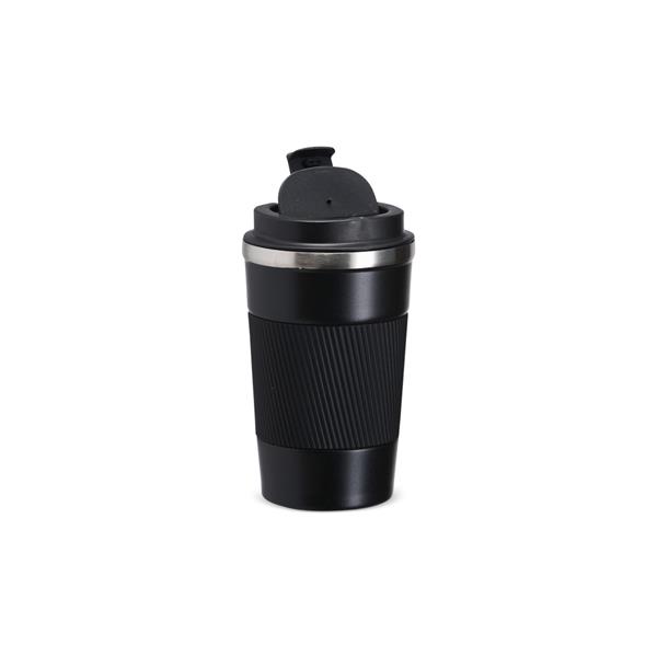 Copo térmico em inox 304 com pintura eletrostática, base antiderrapante e capacidade máxima de 350 ml. Possui estrutura de parede dupla e vedação a vácuo, permitindo a conservação da temperatura de líquidos por mais tempo. Conta ainda com tampa rosqueável em plástico com trava protetora no bocal e luva removível em silicone.