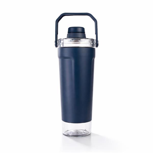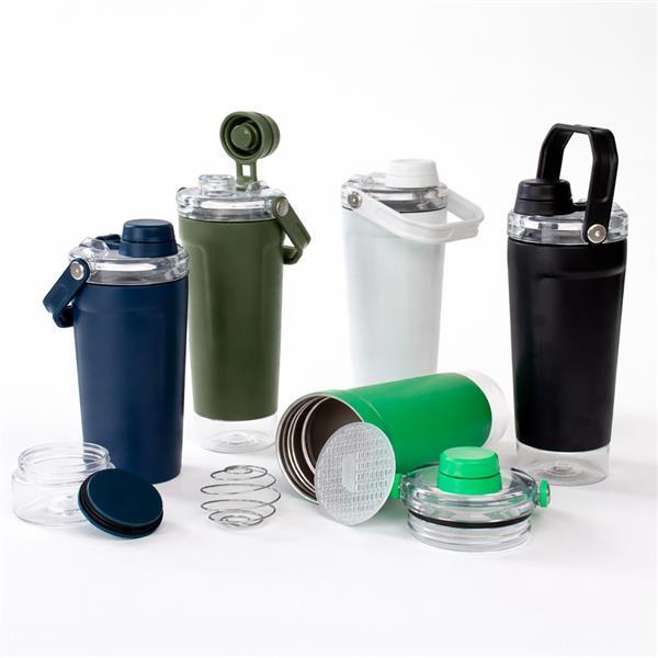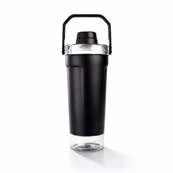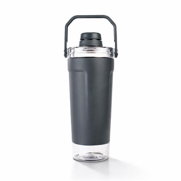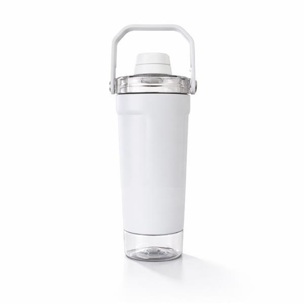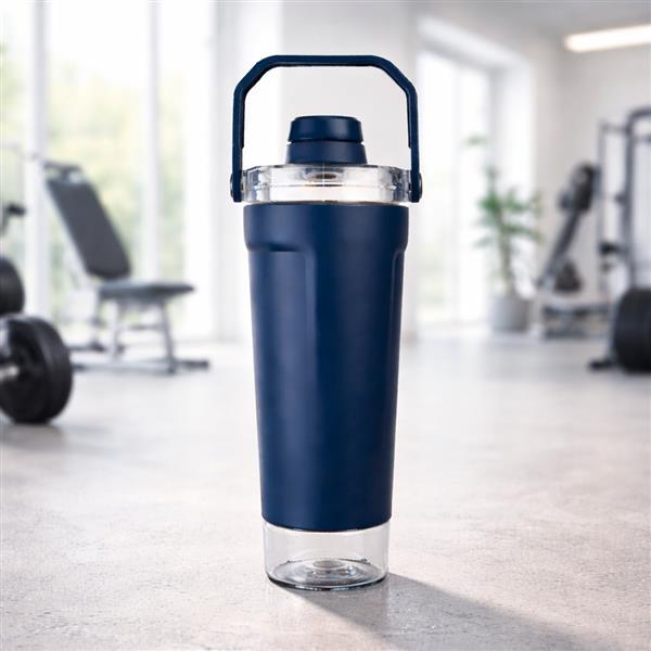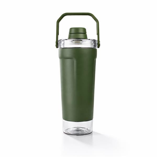 Coqueteleira térmica de parede dupla, com parte externa em inox 201 e pintura eletrostática, e camada interna em inox 304. Com capacidade máxima de 650 ml, possui tampa rosqueável em polipropileno (PP) e policarbonato (PC), com protetor para o bocal e alça para transporte. Apresenta fundo rosqueável em PET com tampa de pressão, ideal para guardar suplementos. Acompanha mola misturadora em inox e peneira plástica.