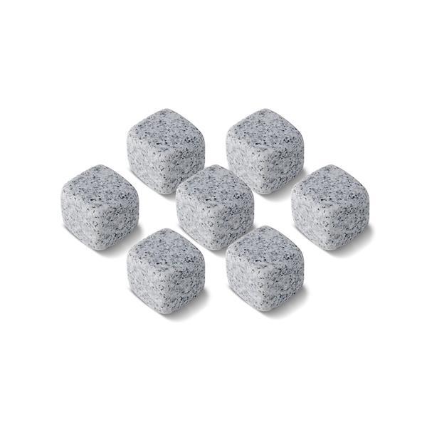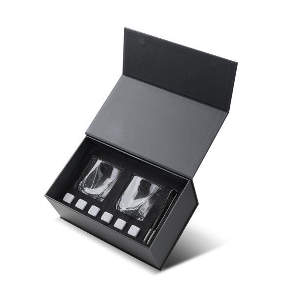 Kit drink contendo 2 copos de vidro (200ml cada), 1 pinça para gelo e 6 pedras de granito para gelo, acondicionado em caixa presenteável.