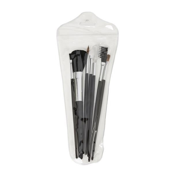 Descrição: Kit pincel com 7 peças em estojo plástico. Possui pincel para delineado, pincel aplicador de sombra, pincel para sombra, pincel para marcação, pincel para esfumar, pincel pente sobrancelha e pincel para blush. Medidas aproximadas para gravação (CxL): Estojo 13 cm x 6 cm – Pinceis menores 0,3 cm x 4 cm – Pincel blush 5 cm x 0,7 cm Tamanho total aproximado (CxL): 23,6 cm x 9,6 cm Peso aproximado (g): 31