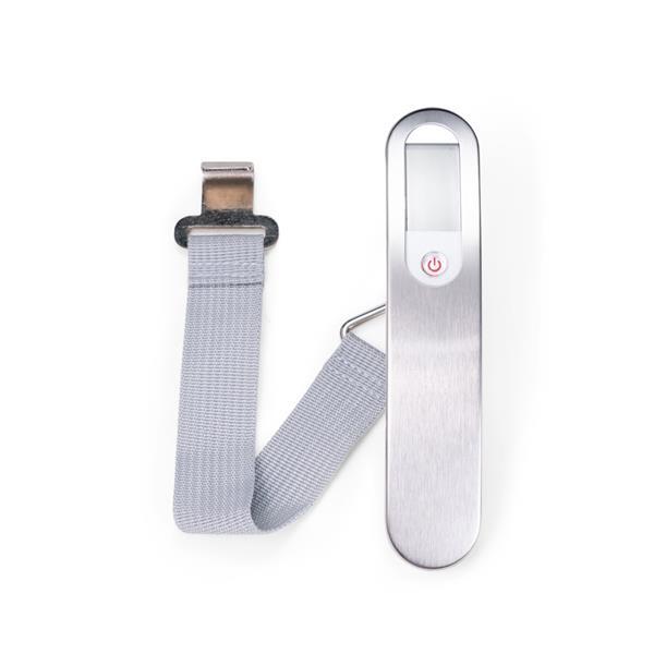 Balança digital para medição de malas e bagagens em geral. Possui capacidade máxima de 50 kg e estrutura em plástico e metal, além de visor em LCD para exibição do peso e cinto de nylon com gancho para fixação da bagagem. Funciona por uma bateria CR2032 inclusa. Altura : 3,4 cm Largura : 14,7 cm Profundidade : 2,9 cm Peso aproximado (g): 87