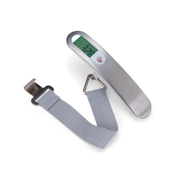 Balança digital para medição de malas e bagagens em geral. Possui capacidade máxima de 50 kg e estrutura em plástico e metal, além de visor em LCD para exibição do peso e cinto de nylon com gancho para fixação da bagagem. Funciona por uma bateria CR2032 inclusa.
