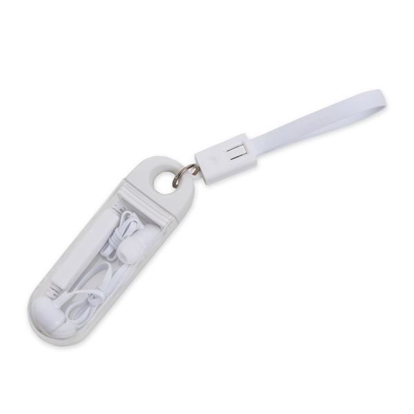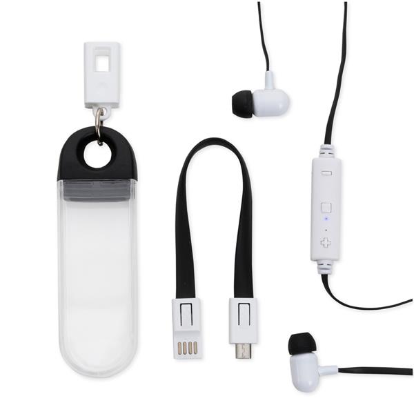 Fone de ouvido bluetooth intra-auricular com microfone, estojo e cabo USB para carregamento. A tampa do estojo possui uma alça que pode ser removida do suporte, revelando as pontas do cabo USB. Altura : 10,8 cm Largura : 3,4 cm Espessura : 1,9 cm Medidas aproximadas para gravação (CxL): 2,5 cm x 6 cm Peso aproximado (g): 45