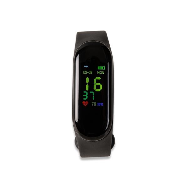 Pulseira inteligente M3. O smartwatch é um relógio fit impermeável com sensor que monitora suas atividades do dia a dia para o controle de sua saúde, tem funções como: pedômetro, contador de quilometragem, monitor de calorias gastas, monitor de frequência cardíaca, monitor de pressão arterial, monitor de oxigenação sanguínea, alerta para localização de celular, alerta de mensagens, entre outros. Contém slot USB acoplado no próprio relógio para o carregamento. Largura : 2 cm Comprimento : 24,5 cm Medidas aproximadas para gravação (CxL): 1,3 cm x 7 cm Peso aproximado (g): 25