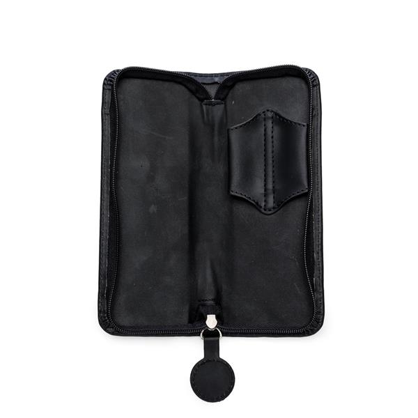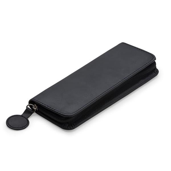 Estojo de couro sintético para duas canetas. Possui zíper com “pegador” circular de couro. Medidas aproximadas para gravação (CxL): 15,5 cm x 5,5 cm Tamanho total aproximado (CxL): 16,5 cm x 6,7 cm Peso aproximado (g): 40