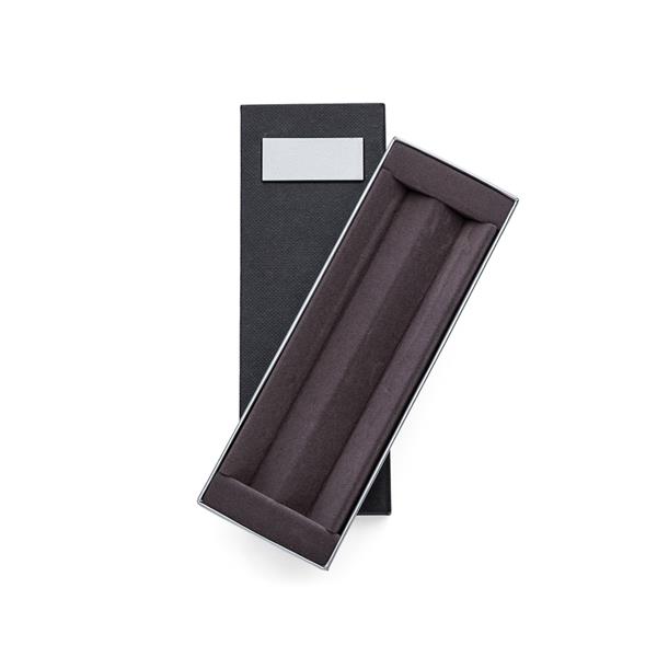 Estojo de papel para duas canetas. Capa de papel texturizado com placa plástica para personalização, estojo revestido com veludo. Medidas aproximadas para gravação (CxL): 4,2 cm x 1,8 cm Tamanho total aproximado (CxL): 17,9 cm x 6,5 cm x 2,5 cm Peso aproximado (g): 76
