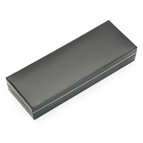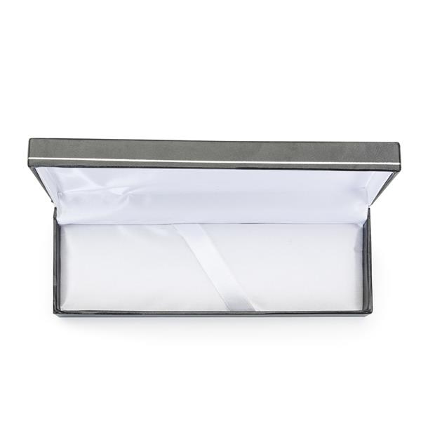 Estojo de plástico para duas canetas com revestimento de couro sintético e parte interna com espuma e fita de cetim, possui uma linha prateada na parte externa. Largura : 6,5 cm Comprimento : 17,6 cm Medidas aproximadas para gravação (CxL): 16,8 cm x 5,8 cm Peso aproximado (g): 90