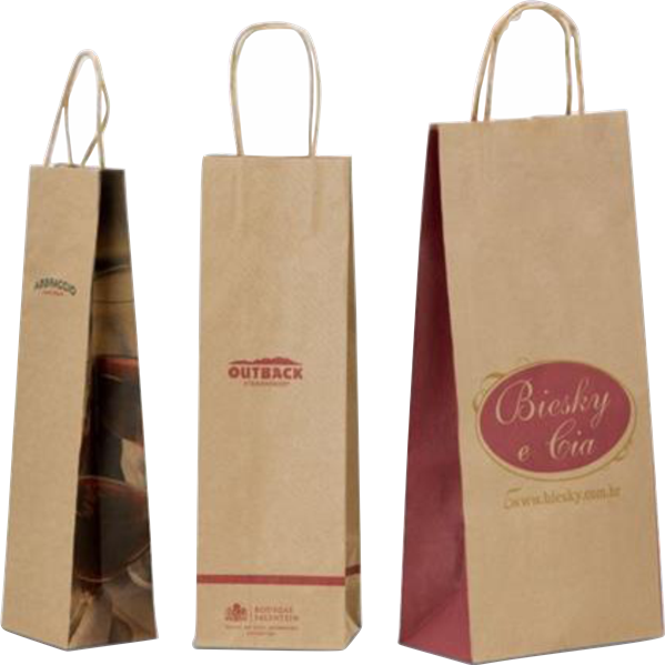 Sacola confeccionada em papel Kraft pardo com alça em papel torcido. Personalização em até 3 cores. Medidas diversas disponíveis, consulte.
