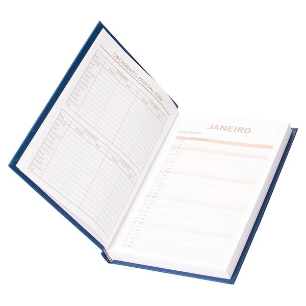 Agenda 2024 com capa em cromato, contém páginas para dados pessoais, calendários de 2023 à 2025, orçamentos, anotações, planejamentos, endereços de contatos e mapas.