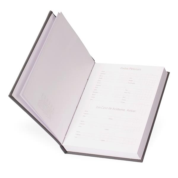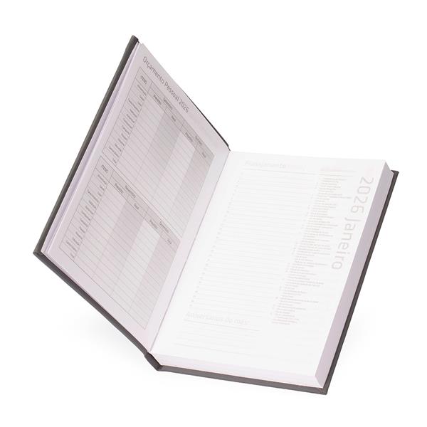 Agenda 2026 com capa emborrachada. Conta com páginas dedicadas para dados pessoais, calendários de 2025 a 2027, orçamento pessoal, planejamento mensal, espaço para anotações diárias e lista de contatos e aniversários.