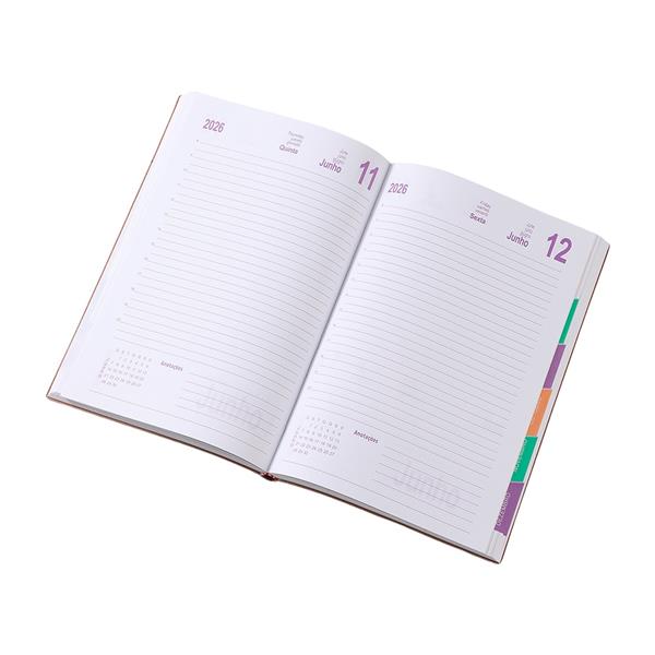 Agenda 2026 de couro sintético com abas mensais e marcador de página em cetim. Contém folhas para dados pessoais, calendários 2026 à 2028, planejamento 2026, DDI, página de conversões e páginas de contatos. Largura : 14,5 cm Espessura : 1,7 cm Comprimento : 20,9 cm Peso aproximado (g): 331