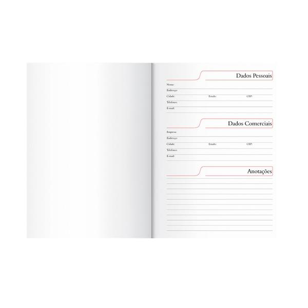 Agenda diária 2026 emborrachada. Contém fita de cetim marca página, dados pessoais, calendários de 2025 à 2027, mapa do Brasil, mapa-múndi, índice telefônico e planejamento.