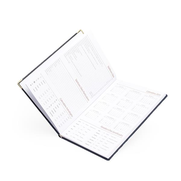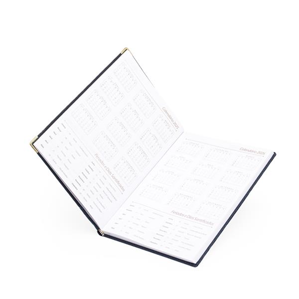 Agenda diária 2026 de couro sintético. Contém fita de cetim marca página, dados pessoais, calendário de 2025 à 2027, mapas, telefone Úteis, planejamentos, códigos do serviço DDI e DDD.