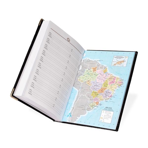 Agenda diária 2026 com capa em couro sintético e marca página em fita de cetim. Possui páginas dedicadas para dados pessoais, calendários de 2025 até 2027, orçamento pessoal, planejamento mensal, lista de contatos e mapas.