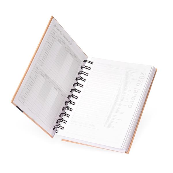 Agenda diária 2026 com capa dura em kraft e encadernação Wire-O. Contém páginas dedicadas a dados pessoais, calendários de 2025 a 2027, orçamento pessoal, planejamento mensal, anotações diárias, lista de contatos e aniversários do mês.