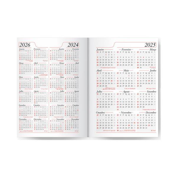 Agenda Diária Capa Lisa Preta com Costura - Capa: Couro Sintético 0,6mm - Miolo de Agenda Diária - 2x2 Cores - 344 páginas - Off-set 63g com Mapa 4x4 Cores - Índice Telefônico - Planejamento - Formato da Agenda: 145x200mm