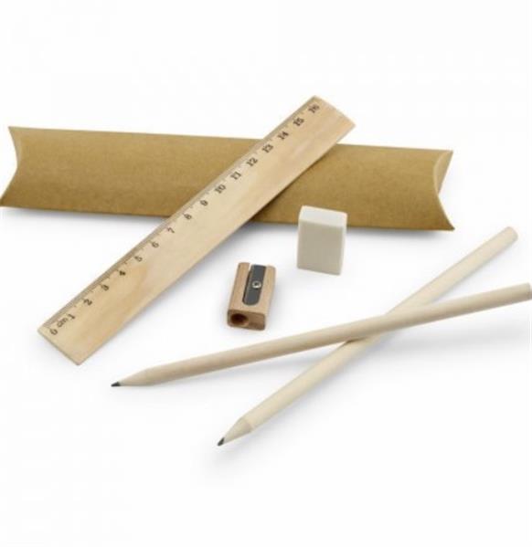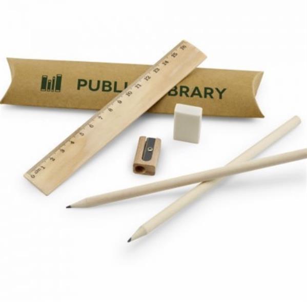Kit de escrita composto por régua de 16,5 cm, 2 lápis de grafite, 1 borracha e 1 apontador. Fornecido com bolsa em cartão. Bolsa: 190 x 45 x 20 mm