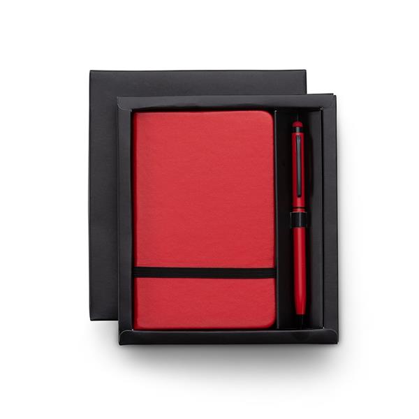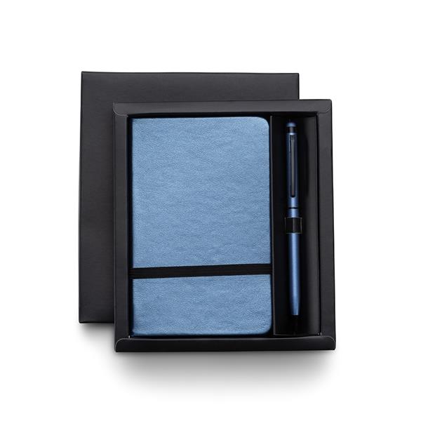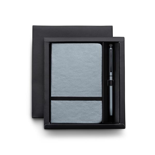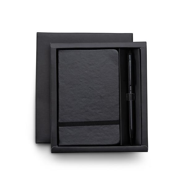 Kit executivo com caderneta tipo moleskine e caneta touch em estojo de papelão. Caderneta em couro sintético com elástico horizontal em nylon, possui aproximadamente 80 folhas amareladas sem pauta e marcador de página em cetim. Acompanha caneta metálica com borracha touch e detalhes em preto, aciona por giro. Altura : 17,1 cm Largura : 14,8 cm Espessura : 2,3 cm Medidas aproximadas para gravação (CxL): Estojo 16 cm x 10,5 cm – Caderneta – 13,7 cm x 8,6 cm – Caneta 0,6 cm x 4,6 cm Tamanho total aproximado (CxL): Caderneta – 14,1 cm x 9,1 cm x 1,4 cm – Caneta 13,6 cm x 1 cm Peso aproximado (g): 174