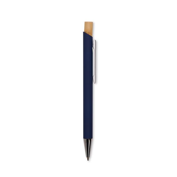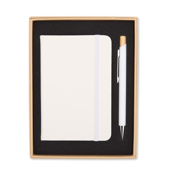 Kit executivo composto por uma caderneta e uma caneta. A caderneta possui capa dura, marca-páginas em fita de cetim e elástico para fechamento, além de aproximadamente 80 folhas com pauta. Por sua vez, a caneta metálica conta com detalhe em bambu, acionamento por clique e carga esferográfica azul de 1,0mm. Acompanha uma caixa de papelão com berço interno em espuma.