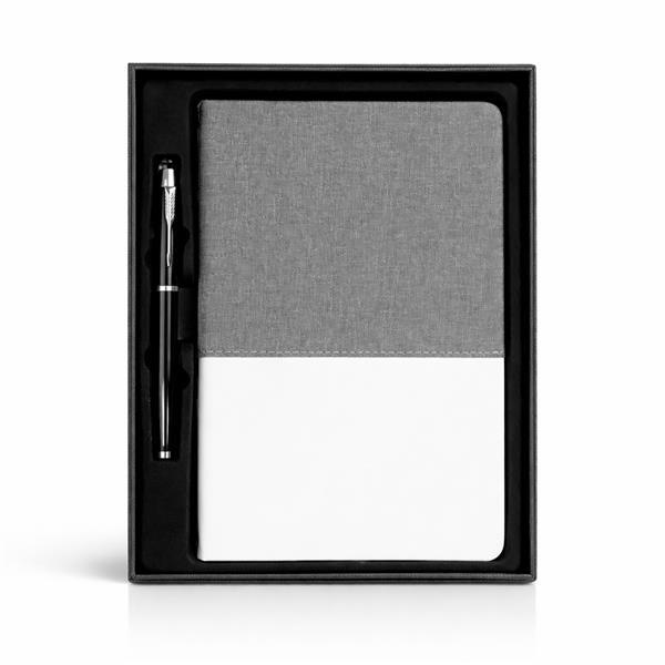 Kit executivo composto por dois itens: uma caderneta e uma caneta. A caderneta possui capa em PU, fecho em elástico, marca páginas em fita de cetim e cerca de 80 folhas marfim pautadas. A caneta metálica possui ponta em plástico ABS e carga esferográfica preta de 0,8 mm. Acompanha caixa em papelão com berço em PET com revestimento aveludado para acomodação dos itens.