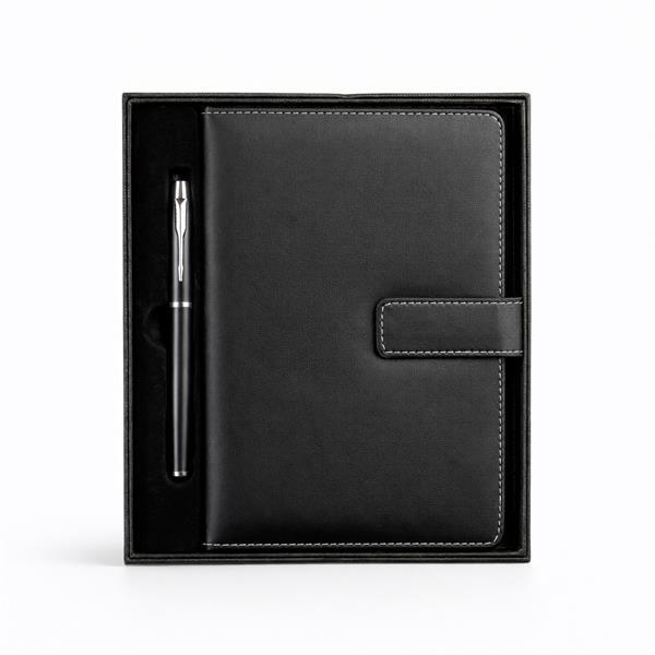 Kit executivo composto por dois itens: uma caderneta e uma caneta. A caderneta possui capa em poliuretano (PU), aba com fecho magnético, marca páginas em fita de cetim e cerca de 96 folhas marfim pautadas e espaço para assinalar dias da semana e datas numéricas. A caneta metálica possui ponta em plástico ABS e carga esferográfica preta de 0,8 mm. Acompanha caixa em papelão com berço em PET com revestimento aveludado para acomodação dos itens.