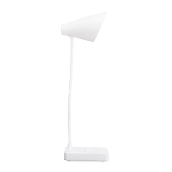 Luminária plástica touch articulável e suporte para celular. Contém três tipos de iluminação: luz branca (fria), luz de descanso (amarela), e luz forte (junção da luz branca com a amarela). Obs: o produto possui bateria interna e acompanha cabo USB.