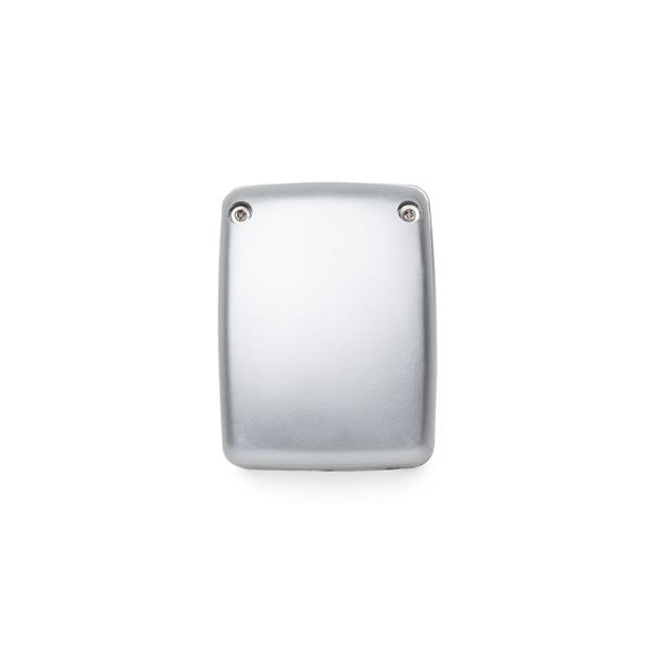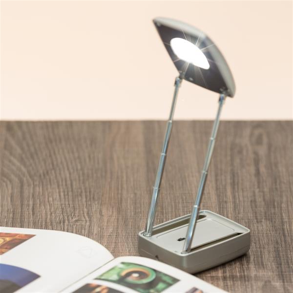 Luminária plástica retangular dupla e retrátil. Para utilizar a luminária interna basta levantar a parte superior e ajustar as hastes, possui botão liga/desliga na base. Possui uma luminária na parte frontal do item, basta apertar o botão na parte inferior da peça para utiliza-lá. Necessário duas pilhas AA(não acompanha). Medidas aproximadas para gravação (CxL): 5,5 cm x 5 cm Tamanho total aproximado (CxL): Fechada 7,9 cm x 5,9 cm – Aberta 16,5 cm Peso aproximado (g): 65