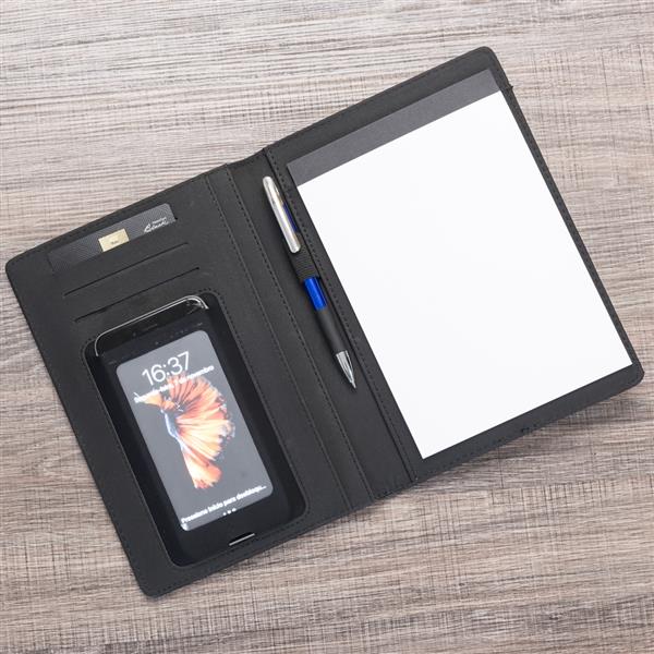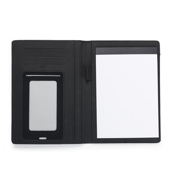 Pasta convenção pequena de couro sintético com porta celular. Possui “bolso” para arquivar documentos, porta celular com visor fosco, três divisórias para cartões, suporte elástico para caneta(não acompanha) e bloco com aproximadamente 20 folhas brancas pautadas de verso liso. Medidas aproximadas para gravação (CxL): 23 cm x 16 cm Tamanho total aproximado (CxL): 24,3 cm x 17,4 cm Peso aproximado (g): 275