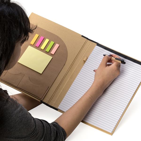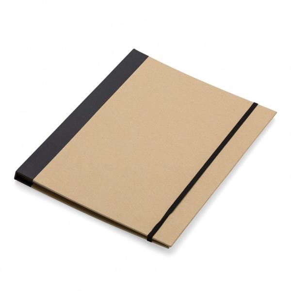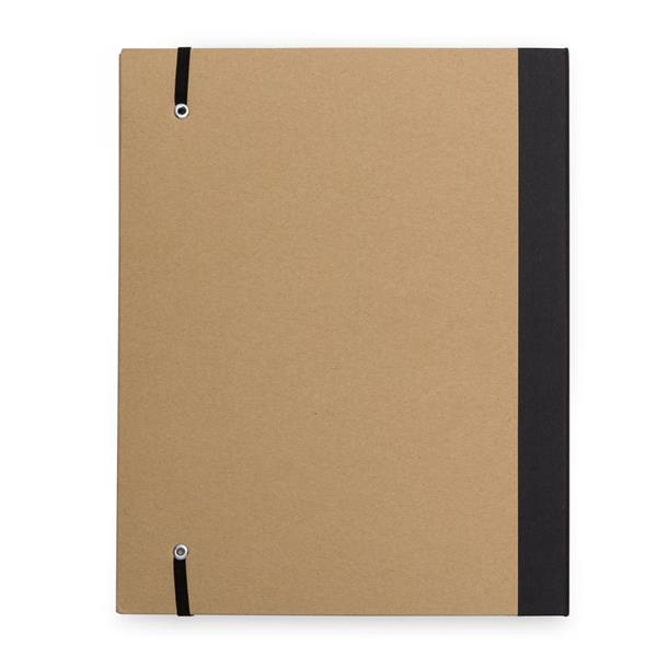 Pasta convenção ecológica, modelo kraft. Frente e verso da capa lisos com uma faixa preta na lateral, possui elástico preto para fechar a pasta. Há um “bolso” interno grande com cinco blocos autoadesivos coloridos com aproximadamente 25 folhas, bloco amarelo com aproximadamente 25 folhas, dois suporte porta cartão, suporte e caneta de papelão(clip plástico) e bloco com aproximadamente 25 folhas pautadas com verso liso(tamanho A4). Altura : 30,2 cm Largura : 24,5 cm Medidas aproximadas para gravação (CxL): 29 cm x 21 cm Peso aproximado (g): 400