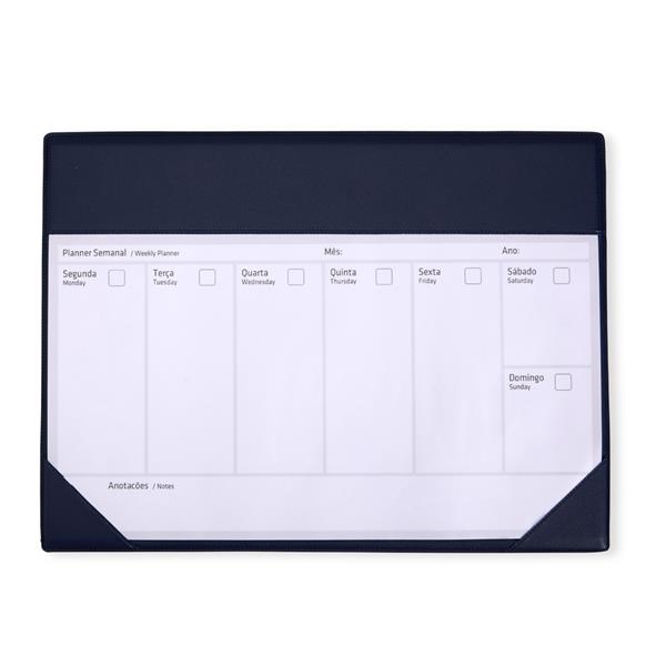 Planner semanal de mesa com base em papelão revestida em PVC. Acompanha bloco com cerca de 20 folhas destacáveis em tamanho A4 para anotações semanais.