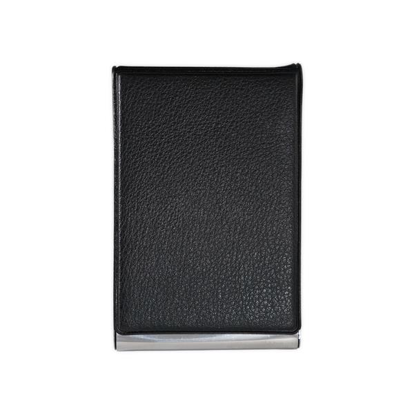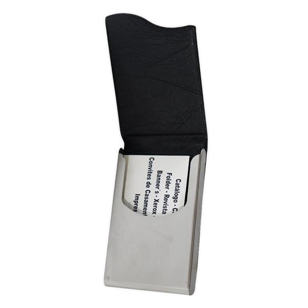Porta cartão de couro sintético com abertura superior de imã. Metal prata espelhado, parte interna revestida de veludo. Medidas aproximadas para gravação (CxL): 6,5 cm x 5,5 cm Tamanho total aproximado (CxL): 9,4 cm x 6,2 cm x 1,8 cm Peso aproximado (g): 43
