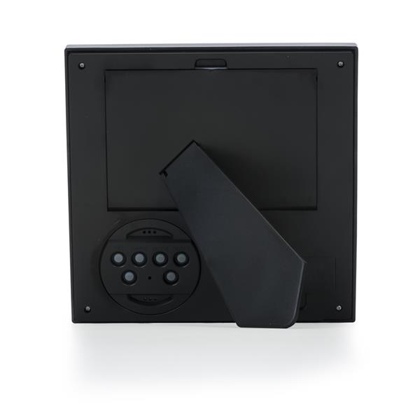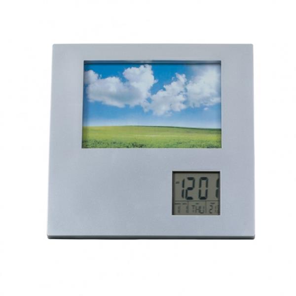 Porta retrato plástico 9 x 13 com relógio digital. Parte traseira da peça na cor preta, compartimento com apoiador e foto basta levantá-lo para trocar, compartimento de configuração pode ser rotacionado caso queira utilizar a foto vertical/horizontal. Fucionamento – SET: ao pressioná-lo poderá fazer alterações nas horas/minutos, ano, mês e data. TIMER: ao pressioná-lo ativará função timer. MODE: ao pressioná-lo poderá fazer alterações no alarme e toque do alarme, ativa/desativa alarme. RESET: restaura configurações de fábrica. ADJ: ao pressioná-lo poderá fazer alterações no sistema de visualização de horas(24hs ou AM/PM). C(celsius)/F(fahrenheit): altera o sistema de visualização de graus(Celsius ou Fahrenheit). Utiliza 2 pilhas palito AAA(não acompanha). Medidas aproximadas para gravação (CxL): 7,5 cm x 10,5 cm Tamanho total aproximado (CxL): 18,2 cm x 18,1 cm Peso aproximado (g): 255