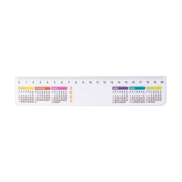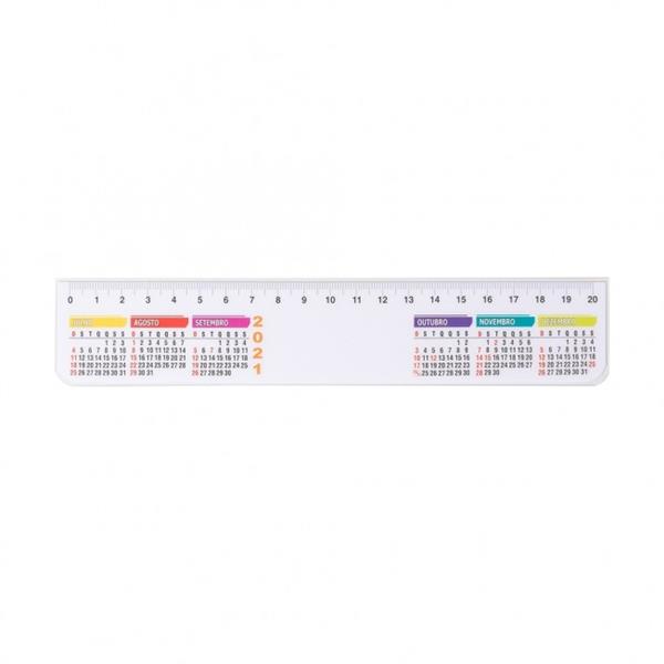 Régua plástica de 20cm com calendário. Impressa em papel offset e encapsulada em plástico rígido Medidas aproximadas para gravação (CxL): 2,5 cm x 5 cm Tamanho total aproximado (CxL): 4 cm x 21,2 cm Peso aproximado (g): 8