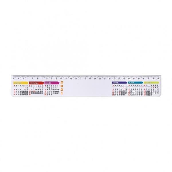 Régua plástica de 30cm com calendário. Impressa em papel offset e encapsulada em plástico rígido, sem contorno na grade de meses Medidas aproximadas para gravação (CxL): 3 cm x 10 cm Tamanho total aproximado (CxL): 4,4 cm x 30,9 cm Peso aproximado (g): 13