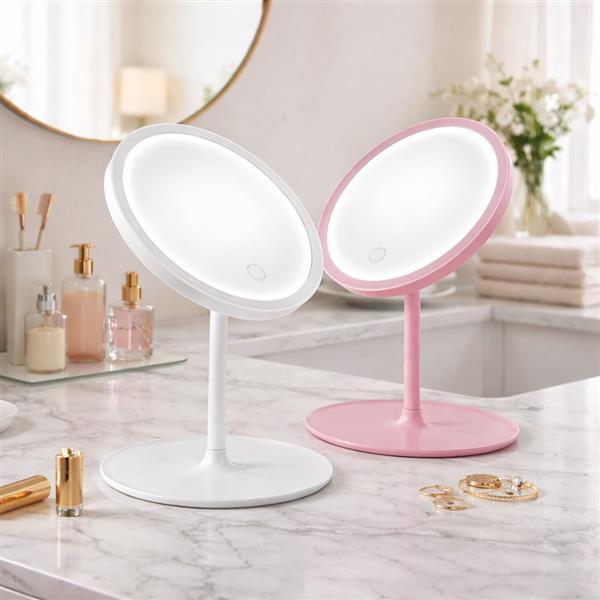 Espelho de mesa com estrutura montável em plástico, movimentação vertical de até 90 graus, iluminação em LED com três níveis de ajuste e entrada USB-C para recarga. Acompanha cabo USB-C.