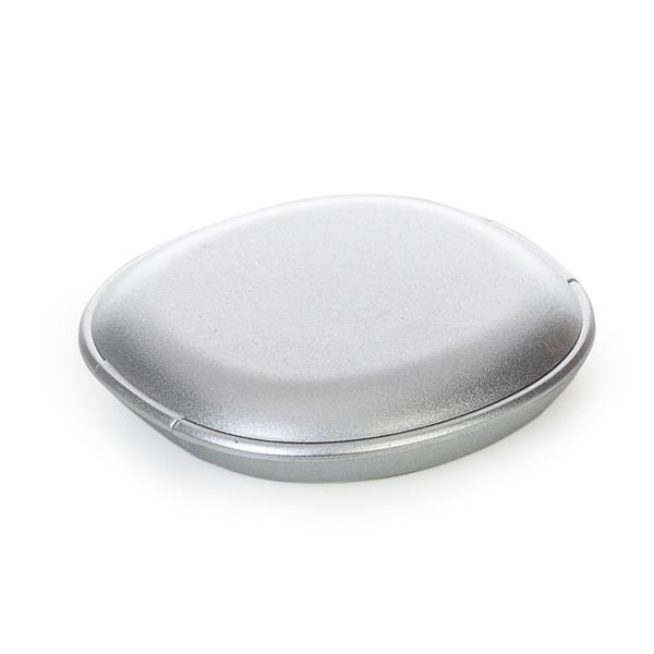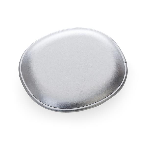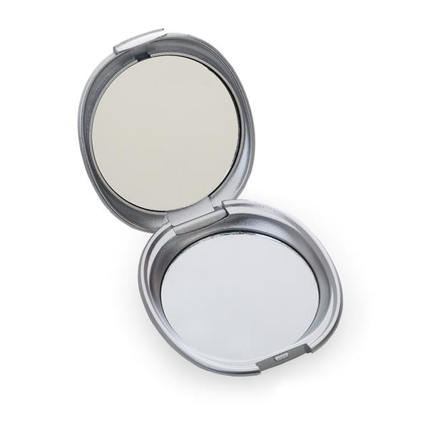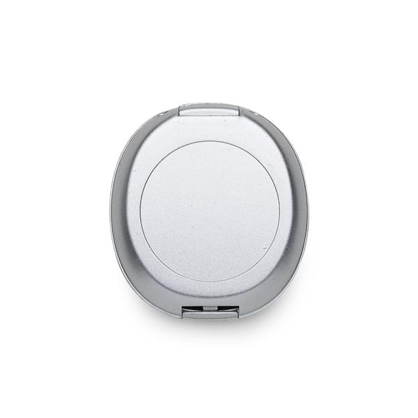 Espelho oval plástico duplo sem aumento. Área central superior plana e verso com detalhe circular. Medidas aproximadas para gravação (CxL): 5 cm x 4,3 cm Tamanho total aproximado (CxL): 7,2 cm x 6,6 cm Peso aproximado (g): 37