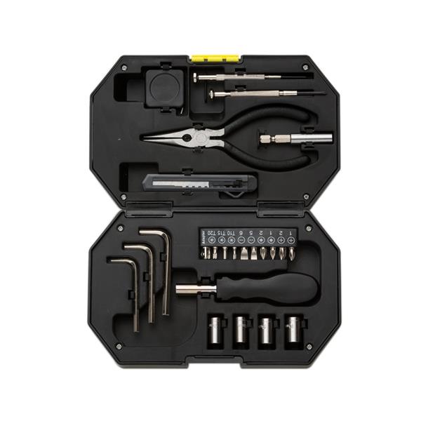 Kit ferramenta 24 peças com lanterna acoplada no estojo. Possui: chave de Fenda, chave Philips, chave que alonga ferramenta auxiliar, alicate, trena de 1 metro(sem trava), estilete, conjunto 10 pontas(4 chaves phillips, 2 chaves fenda, 3 chaves torx e um adaptador), chave auxiliar, 4 extensores bocais(7MM, 8MM, 9MM e 10MM) e 3 tamanhos de chave Allen. Estojo plástico resistente com trava amarela, tem o suporte da lanterna flexível. Além do botão amarelo liga/desliga, para utilizar a lanterna é necessário 4 pilhas AA(não inclusas), para inseri-las é necessário levantar o cabeçote e braço da lanterna, desparafusar a parte traseira(2 parafusos) e parte frontal(1 parafuso) para levantar a tampa onde são colocadas as pilhas. Medidas aproximadas para gravação (CxL): 12 cm x 3,6 cm Tamanho total aproximado (CxL): 20 cm x 12,6 cm x 7 cm Peso aproximado (g): 729
