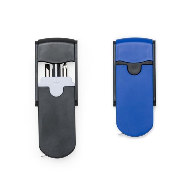 Kit ferramenta plástico 3 peças com trena 1 metro. Material plástico colorido com a lateral e detalhe central preto, basta puxar para cima as laterais para levantar a tampa. Possui: 1 chave philips com ponta inversa chave de fenda, 1 chave de fenda com ponta inversa chave philips e chave canhão alongadora. Trena de 1 metro(sem trava) na parte inferior. Medidas aproximadas para gravação (CxL): 5 cm x 3,1 cm Tamanho total aproximado (CxL): 9 cm x 4 cm x 1,4 cm Peso aproximado (g): 47