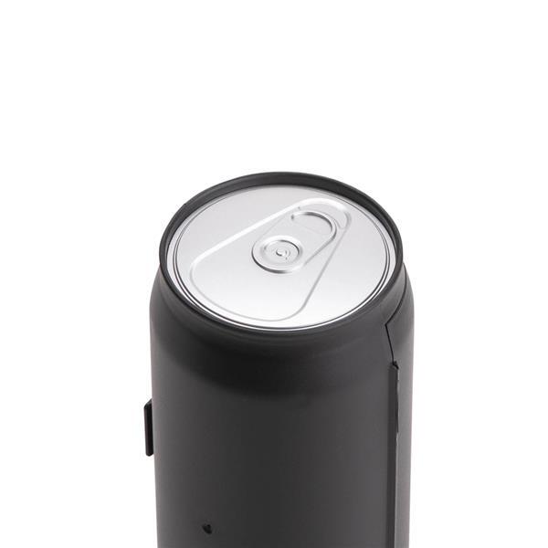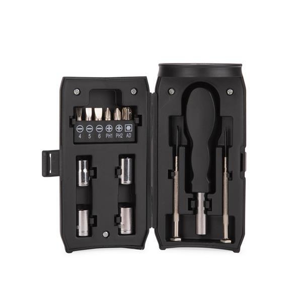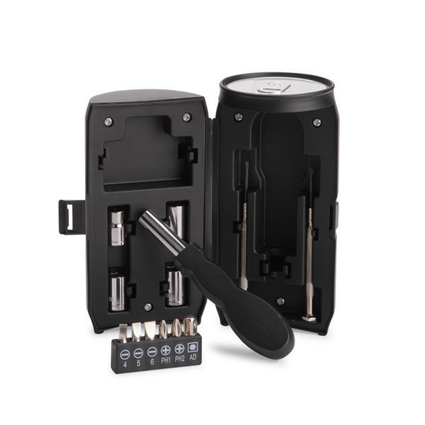 Kit de ferramentas com 13 peças em aço carbono. O conjunto conta com chave porta-bits magnética com cabo em polipropileno (PP), seis bits em formatos diferentes, sendo 3 de fenda, 2 Phillips e 1 adaptador para soquetes, além de duas chaves de precisão e 4 soquetes sextavados. Acompanha caixa plástica em formato de lata de bebida, com trava de fechamento.