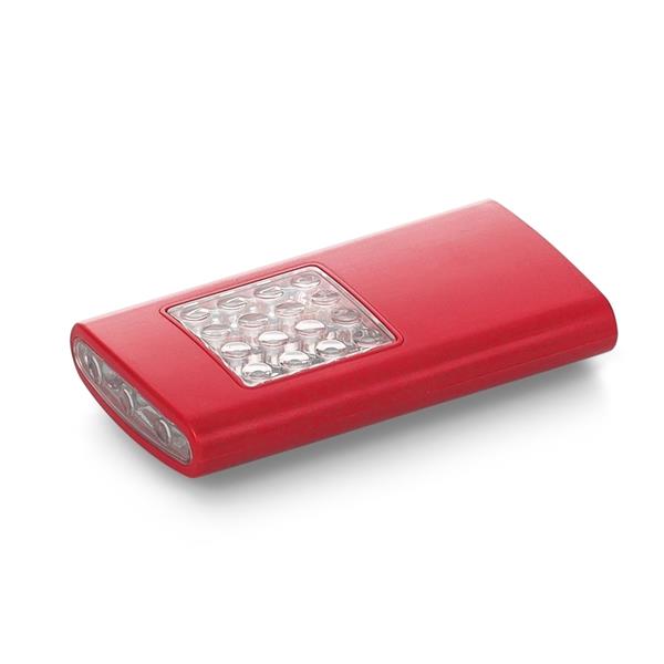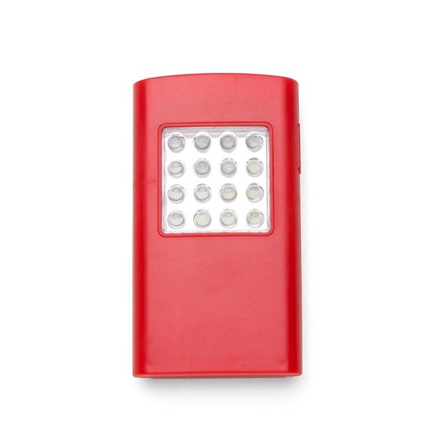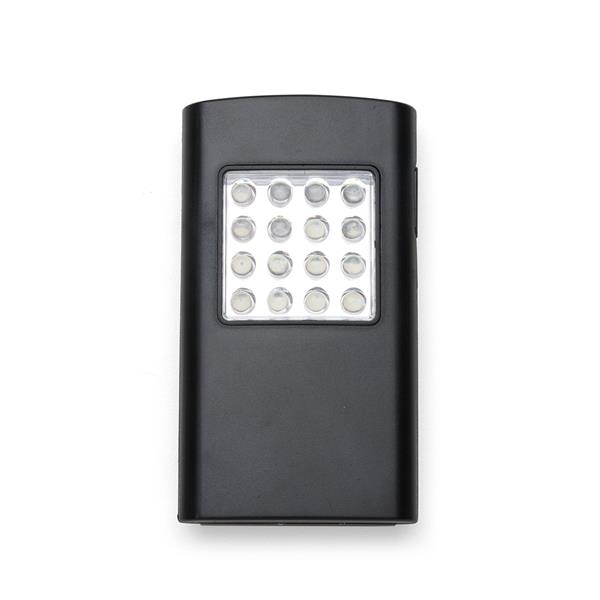 Lanterna plástica de led com imã na parte traseira e suporte metal para gancho. Possui 3 leds na parte superior e 16 leds na parte frontal, ao apertar uma vez o botão na lateral acende o led frontal, apertando duas vezes acende o led superior e apertando pela terceira vez apaga-se o led. Necessário 3 pilhas AAA(não acompanha). Medidas aproximadas para gravação (CxL): 4,5 cm x 4,5 cm Tamanho total aproximado (CxL): 10,6 cm x 6 cm x 1,7 cm Peso aproximado (g): 51