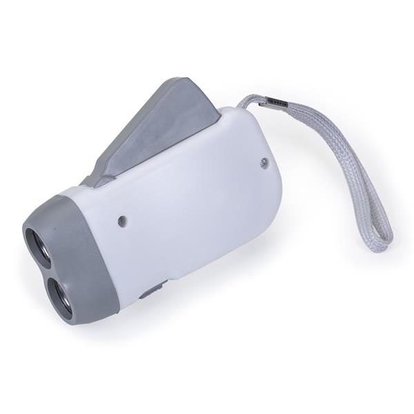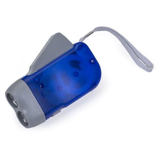 Lanterna plástica com 2 leds, pressionando o “gatilho” gera energia para alimentar a lanterna dínamo. Possui botão para ligar/desligar lanterna, botão para travar gatilho e acompanha cordão. Medidas aproximadas para gravação (CxL): 8 cm x 4 cm Tamanho total aproximado (CxL): 10,2 cm x 5,3 cm Peso aproximado (g): 61