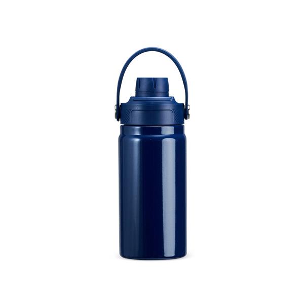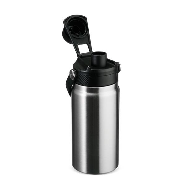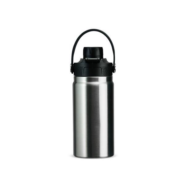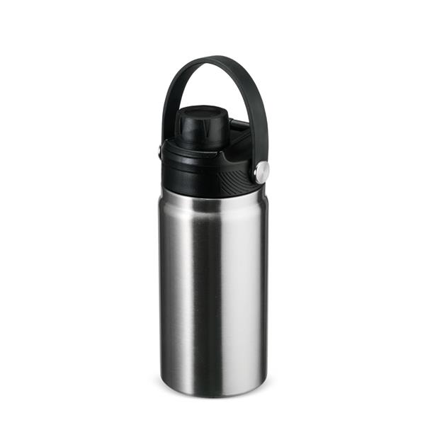 Garrafa térmica em inox com capacidade para até 400 ml. Apresenta estrutura de parede dupla e vedação a vácuo, que mantém a temperatura de líquidos por mais tempo sem transferência para o exterior. Possui tampa plástica rosqueável com protetor de o bocal e alça fixa para transporte.