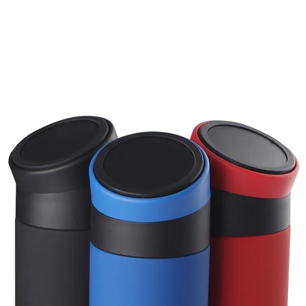 Garrafa térmica em aço inox com parede dupla 400 ml. Tampa rosqueável com apoio para celular. Altura : 21,3 cm Largura : 6,3 cm Circunferência : 20,7 cm Medidas aproximadas para gravação (CxL): 13 cm X 3 cm Peso aproximado (g): 257