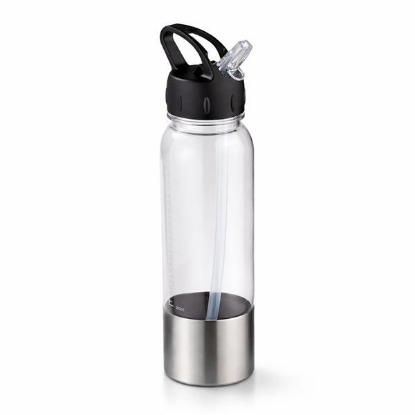 Squeeze feito em plástico AS livre de BPA, fundo com revestimento externo em aço inox 201, capacidade máxima de 750 ml e marcação de volume de até 750ml. Possui tampa rosqueável em polipropileno (PP) com bico retrátil em poliestireno (PS), canudo removível e alça fixa para transporte.