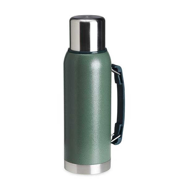 Garrafa térmica de inox livre de BPA com capacidade de 1 litro. Contém alça para transporte.