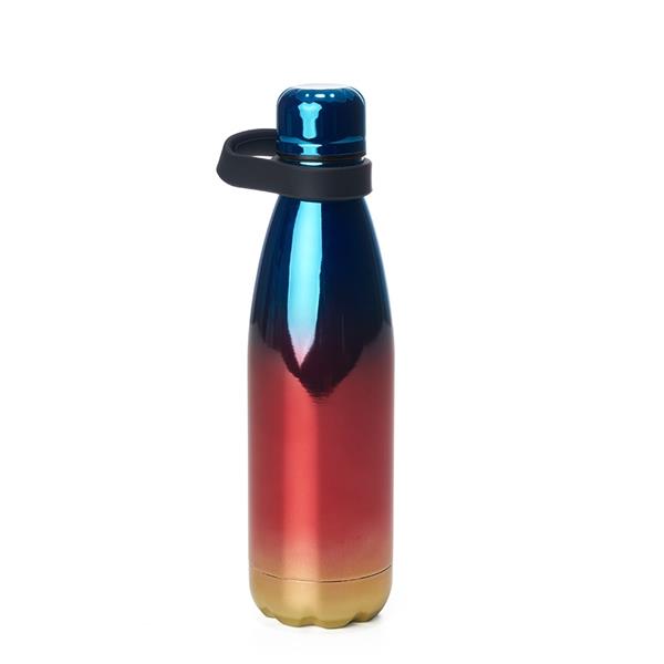 Garrafa térmica em Inox com parede dupla. Capacidade para 510ml. Acompanha tampa com vedação a prova de vazamento e alça de silicone para transporte. Altura : 25,5 cm Largura : 9,5 cm Circunferência : 22,5 cm Medidas aproximadas para gravação (CxL): 9 cm X 4 cm Peso aproximado (g): 304