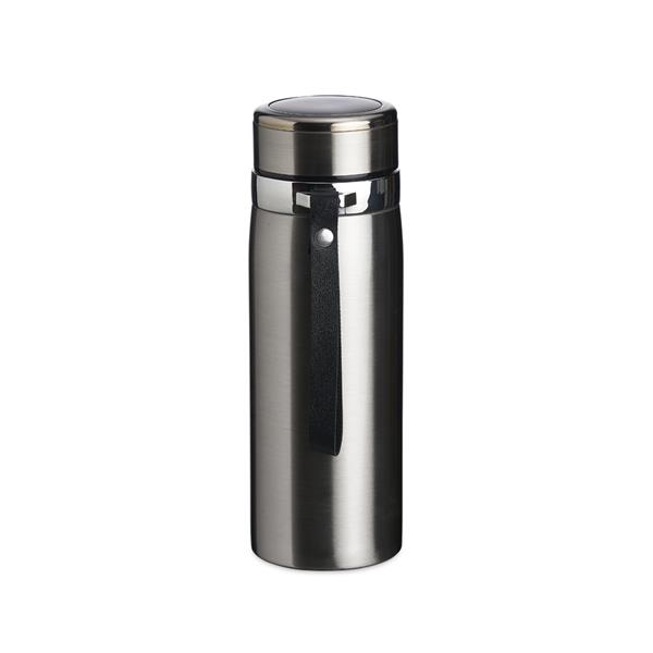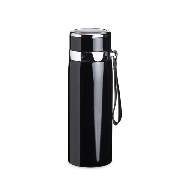 Garrafa térmica 800ml em Inox parede dupla. Possui tampa plástica revestida em Inox com borracha para vedação evitando o vazamento de líquido e prezando a temperatura, infusor e alça em couro sintético. Altura : 24,2 cm Largura : 7,8 cm Circunferência : 25,8 cm Medidas aproximadas para gravação (CxL): 15 cm x 4 cm Peso aproximado (g): 380