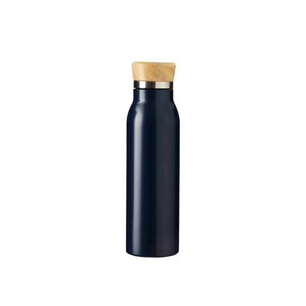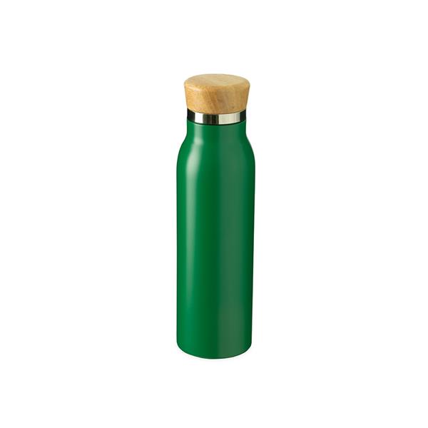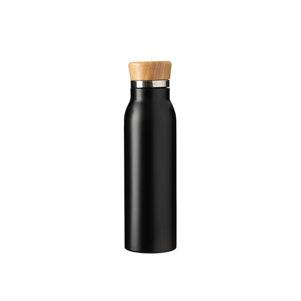 Garrafa térmica feita em inox com pintura em spray, tampa rosqueável em bambu e capacidade máxima de 600ml. Possui estrutura de parede dupla e isolamento a vácuo, permitindo manter a temperatura de líquidos por mais tempo.