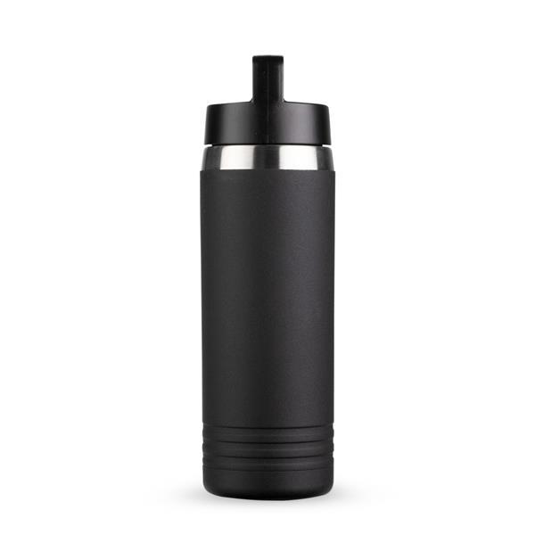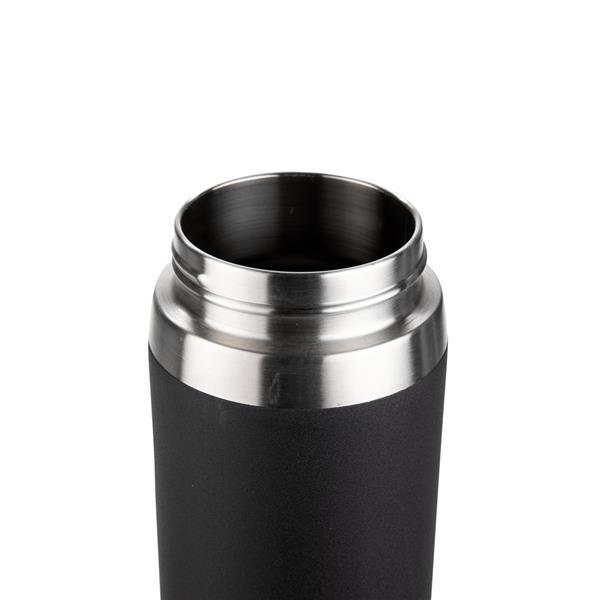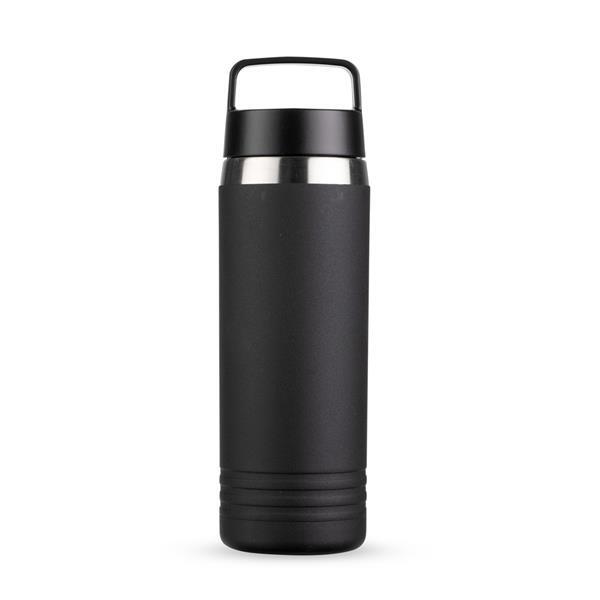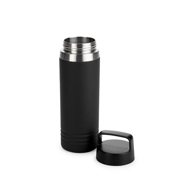 Garrafa térmica em inox com capacidade para até 700 ml. Conta com estrutura de parede dupla e vedação a vácuo para garantir a conservação da temperatura dos líquidos por mais tempo, além de tampa rosqueável em plástico com alça fixa para transporte.